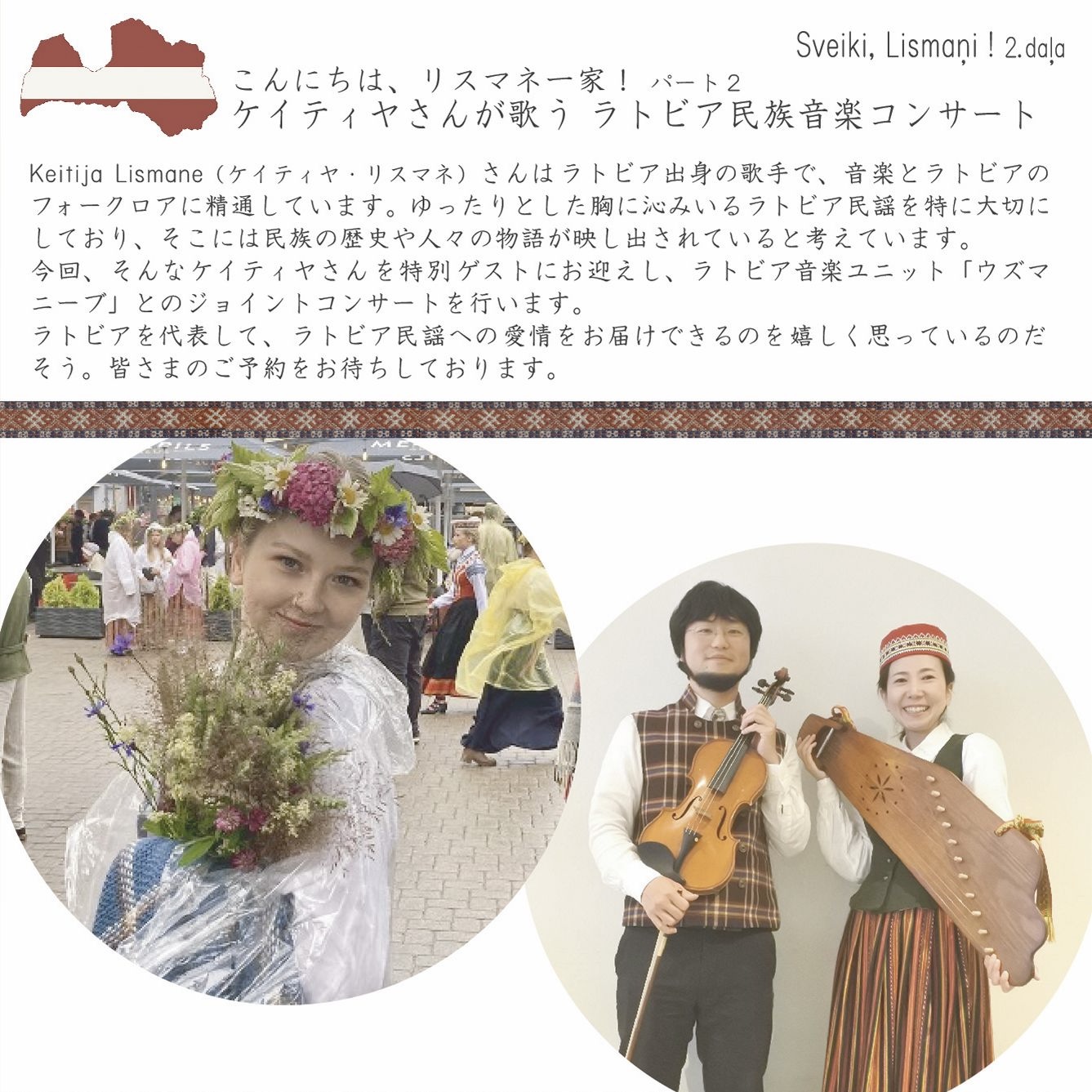 Sveiki, Lismani! 2. dala こんにちは、リスマネ一家!パート2 『ケイティヤさんが歌う ラトビア民族音楽コンサート』 Keitija Lismane(ケイティヤ・リスマネ)さんはラトビア出身の歌手で、音楽とラトビアのフォークロアに精通しています。ゆったりとした胸に沁みいるラトビア民謡を特に大切にしており、そこには民族の歴史や人々の物語が映し出されていると考えています。 今回、そんなケイティヤさんを特別ゲストにお迎えし、ラトビア音楽ユニット「ウズマニーブ」とのジョイントコンサートを行います。 ラトビアを代表して、ラトビア民謡への愛情をお届けできるのを嬉しく思っているのだそう。皆さまのご予約をお待ちしております。 日時:2025年10月12日(日)開場13:00、開演13:30 会場:ダイヤ通音楽ホール(神戸市兵庫区中道通1丁目3-5 森本グラスビル) 料金:3,000円 ご予約:uzmanibu_music@ybb.ne.jp または各メンバーまで |